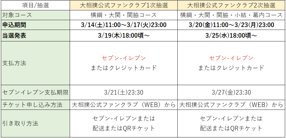 関脇・大関・横綱コースは一次抽選から申し込み可能(二次抽選も申し込み可能)