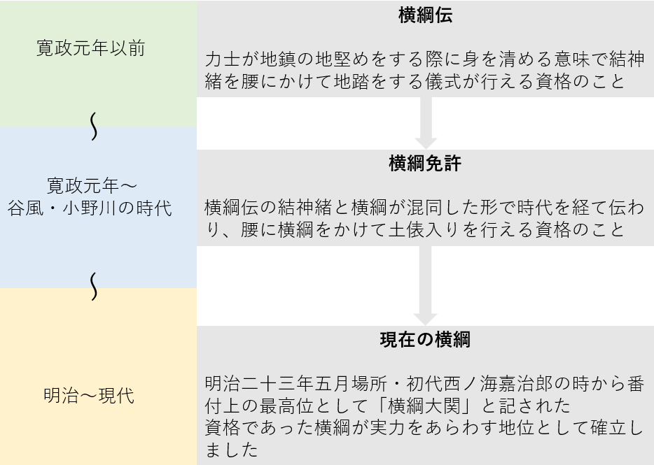 そのため、横綱伝は番付上の最高位でもなく、土俵入りの際に横綱を帯びる資格でもなく、全く異なる意味を持った資格であったことがわかります