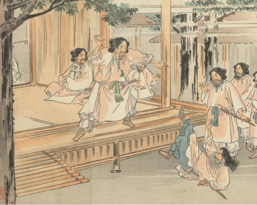野見宿禰清涼殿の南庭に於て當麻の蹶速を蹴殺す