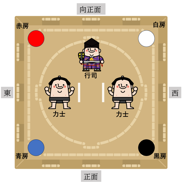 相撲中継なんかを見ていると、審判が変わるときにアナウンサーが「白房下から~親方が来ました」と言っていますね。あれは、この房のことを言っていたんですね