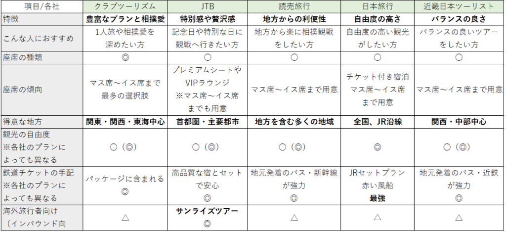 • 大相撲観戦ツアーを取り扱っている旅行会社それぞれの特徴